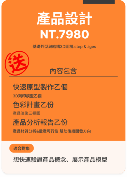 超值設計餐的重點在「快速驗證與打樣」,能幫你確認市場方向與設計可行性。
