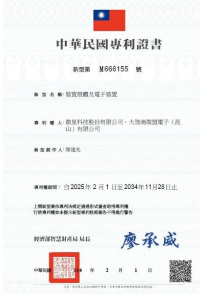 協助「微星科技」完成滑軌結構裝置的設計研發與專利申請,通過檢索與審查,並導入量產筆電。